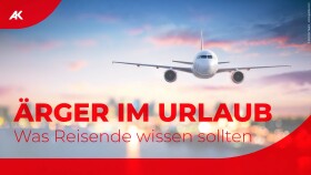 Thumbnail: Bild eines fliegenden Flugzeugs, darunter der Schriftzug "Ärger im Urlaub - Was Reisende wissen sollten"